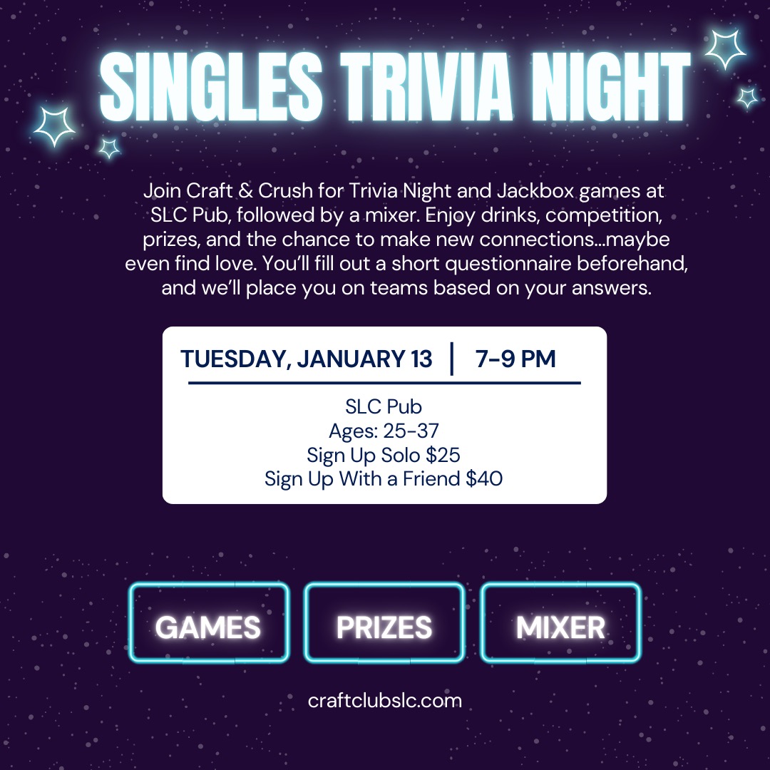 Join Craft & Crush for Trivia Night and Jackbox games at SLC Pub, followed by a mixer. Enjoy drinks, competition, prizes, and the chance to make new connections...maybe even find love. You'll fill out a short questionnaire beforehand, and we'll place you on teams based on your answers.